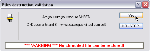 Shred the selected itemsThis option destroys permanently one or more files and/or folders, and possibly the sub-folders, in a single operation. No action, whatsoever, will permit restoration of those files.